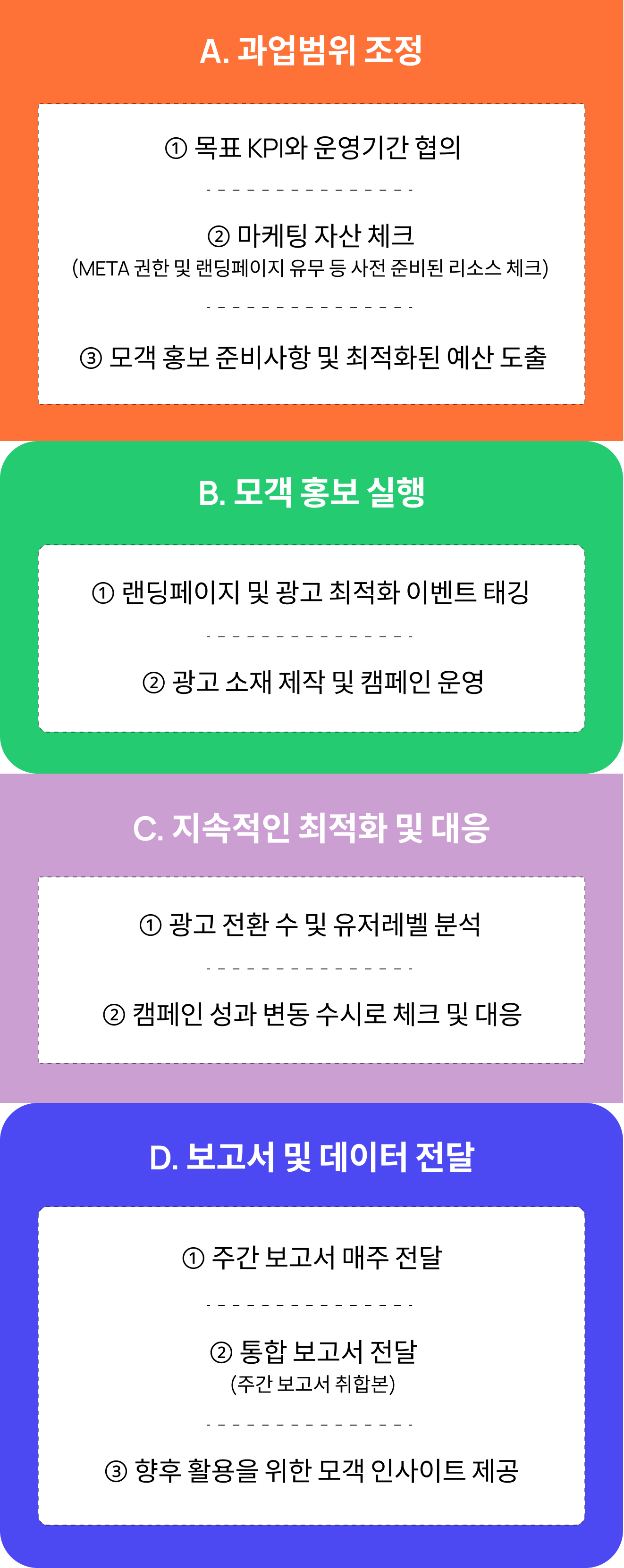 * 노출 지면 필터링, 소재 소구점, 시각적 레이아웃, 이벤트 세팅 및 태깅, 전환 데이터 누적 전략 등