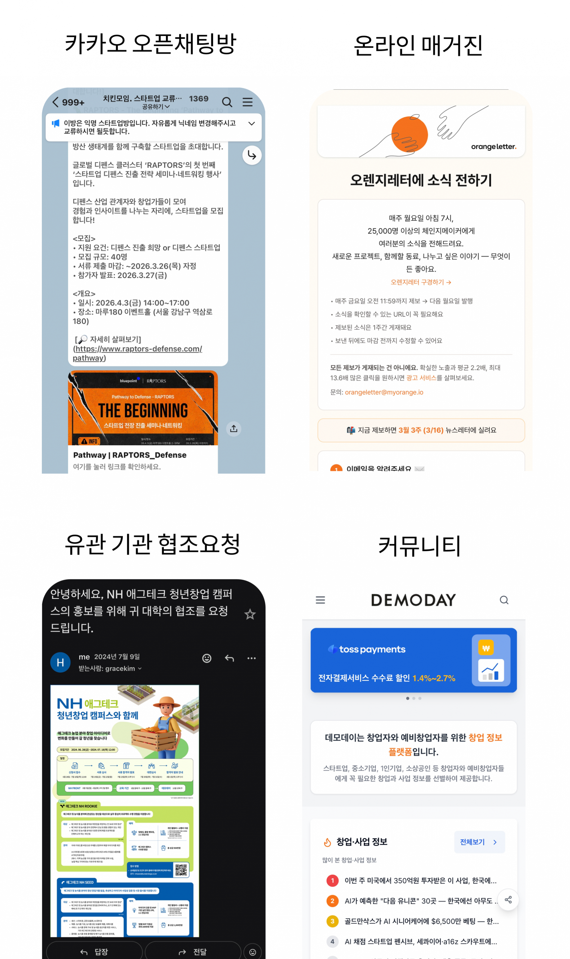 카카오 오픈 채팅방, 유관 기관 협조요청, 온라인 매거진, 커뮤니티 등 접근성은 높지만 피로도가 큰 바이럴/다이렉트 마케팅까지 커버합니다.